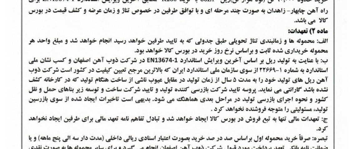 طی این تفاهم‌نامه‌ ۹۰ هزار تن ریل E160 با گریدR260 مطابق آخرین ویرایش استاندارد EN13674-1 از تولیدات ذوب آهن اصفهان ، توسط قرارگاه سازندگی خاتم الانبیاء برای راه آهن چابهار-زاهدان به صورت چند مرحله ای و با توافق طرفین در خصوص تناژ ، زمان عرضه و کشف قیمت در بورس کالا خریداری می شود .
