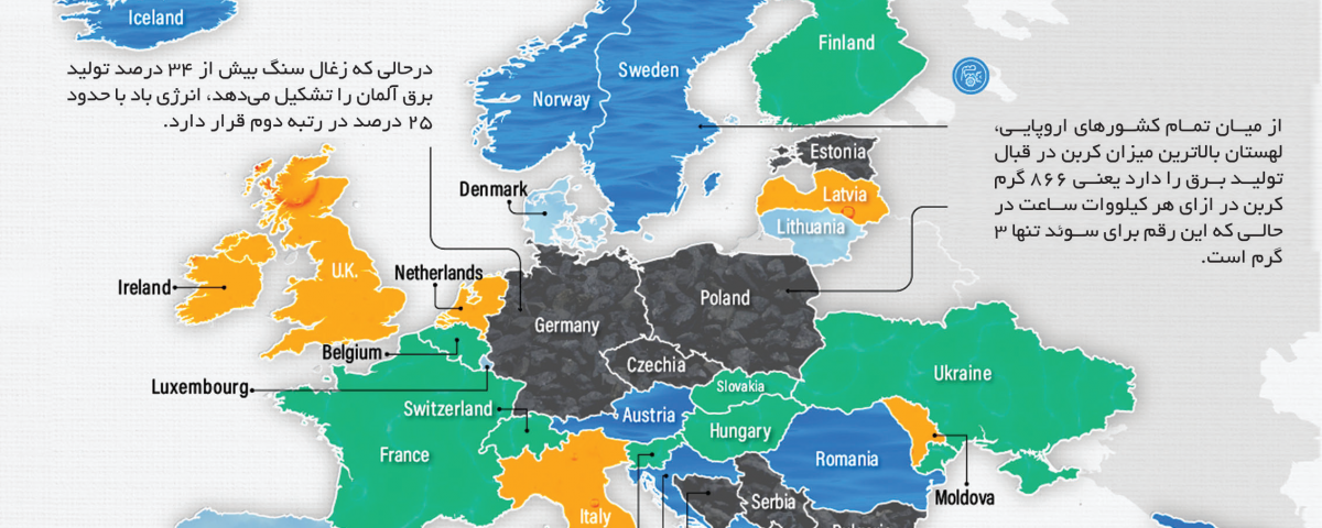این تصویر گرافیکی، کشورهای اروپایی را بر اساس منبع اصلی تولید برق آنها بر اساس دادههای به دست آمده از نقشههای برق (Ekectricity Maps) و IEA در کنار تجزیه و تحلیل تولید برق به تفکیک منبع در سال ۲۰۲۱ ترسیم میکند.