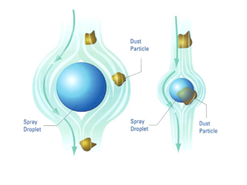 جهت غبارگیری مناب با بازدهی بالاتر از ۹۹/۵ درصد جذب و حذف غبار، شرایط پاشش آب در اسکرابر باید به گونه‌ای طراحی گردد که اولاً احتمال برخورد هر واحد غبار به یک قطره آب وجود داشته باشد و ثانیاً برخورد موثر واقع شود و منجر به حذف و خارج شدن ذرات غبار گردد. مطابق شکل (۳)، اگر اندازه ذرات غبار در جریان مرزی هوای اطراف قطرات آب می‌گیرند و عملاً برخورد موثری برای ذرات ریز صورت نمی‌گیرد که این امر سبب کم‌شدن بازدهی اسکرابر می‌گردد. لذا نازل‌ها بایستی بسته به شرایط ابعادی غبار توانایی اتمایز کردن آب در حد مناسب را داشته باشند.