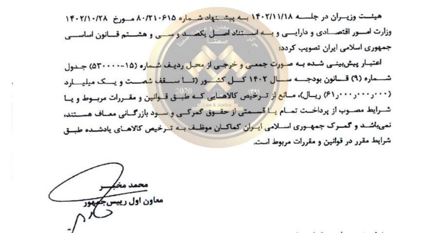 تصويب نامه هیات وزیران درخصوص عدم ممانعت اعتبار رديف شماره (۱۵ـ ۵۳۰۰۰۰) جدول شماره (۹) قانون بودجه سال ۱۴۰۲ کل کشور از ترخيص کالاهايی که طبق قوانين و مقررات از پرداخت تمام يا قسمتی از حقوق گمرکی و سود بازرگانی معاف هستند.