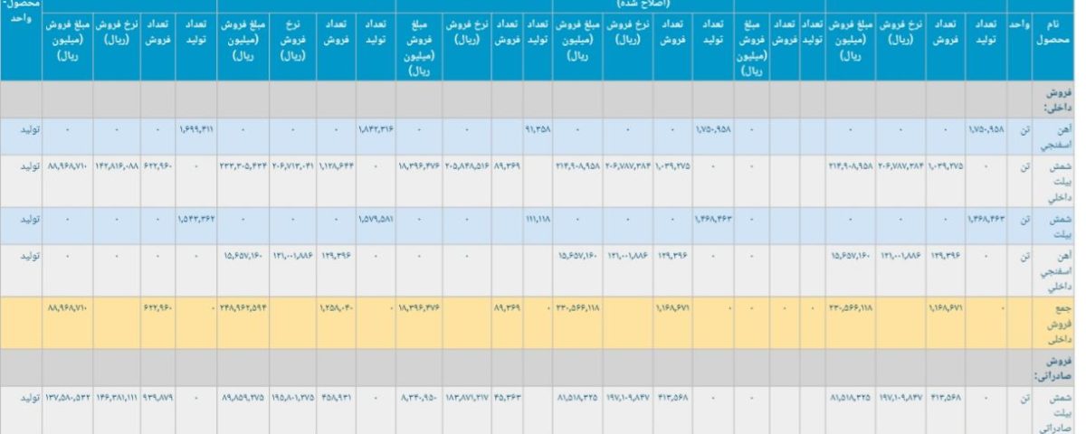 فروش داخلی ۸۹۳۶۹ تن شمش به نرخ ۲۰,۵۸۴,۸۵۱ میلیون تومان به مبلغ ۱۸۳۹,۶ میلیارد تومان.