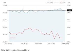 در بورس فلزات لندن قیمت روی روند کاهشی داشت و با ۵۶ دلار کاهش نسبت به هفته گذشته در ۱۱ نوامبر به ۲,۹۷۹ دلار رسید. موجودی انبار LME در این هفته کاهش یافت.