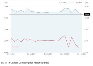 در بورس فلزات شانگهای قیمت مس در این هفته روند کاهشی داشت و با ۳۸۸ دلار کاهش نسبت به هفته گذشته، در ۱۲ نوامبر به ۱۰,۴۹۸ دلار (شامل ۱۳ درصد مالیات بر ارزش افزوده VAT) رسید. با کاهش قیمت مس فروشندگان تمایلی برای فروش ندارند و پیش بینی می شود عرضه داخلی مس چین در هفته های آینده کاهش یابد. از سوی دیگر به دلیل نوسان بازار، خریداران با احتیاط عمل می کنند و تنها در محدوده نیاز خود خرید انجام می دهند. موجودی انبار مس چین در این هفته کاهش یافت.
