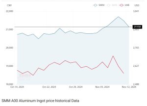 در بورس فلزات شانگهای قیمت آلومینیم در روند کاهشی داشت و با ۳۲ دلار کاهش نسبت به هفته گذشته در ۱۲ نوامبر به ۲,۹۲۴ دلار (شامل ۱۳ درصد مالیات VAT) رسید. تاثیر بسته های حمایتی چین بر بازار کمتر از حد انتظار عمل کرد. همچنین افزایش قیمت آلومینا عامل حمایتی قیمت آلومینیم بود.