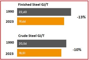 شكل (۱۱): میزان مصرف ویژه انرژی فولاد خام و محصولات آلمان در سال ۱۹۹۰ و ۲۰۲۳