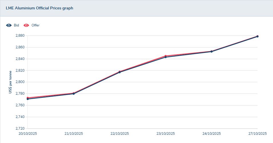 در بورس فلزات لندن قیمت #آلومینیوم در این هفته روند افزایشی داشت و با ۹۸ دلار افزایش نسبت به هفته گذشته در ۲۷ اکتبر به ۲,۸۷۴/۵ دلار رسید. (۰/۵ درصد افزایش)