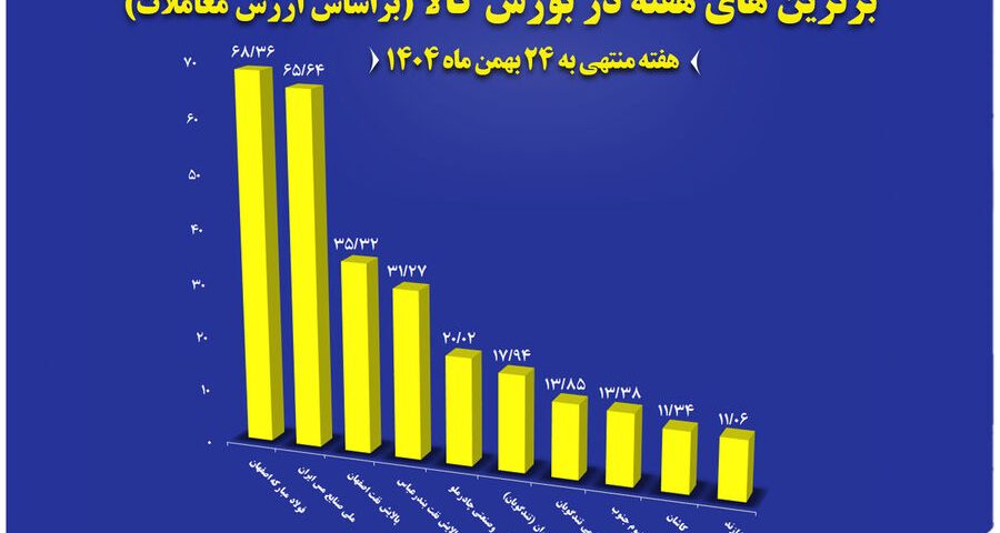 طی هفته منتهی به ۲۴ بهمن ۱۴۰۴ رقم خورد: “فولاد”، “فملی” و “کچاد” در لیست۱۰ شرکت برتر بورس‌کالا براساس ارزش
